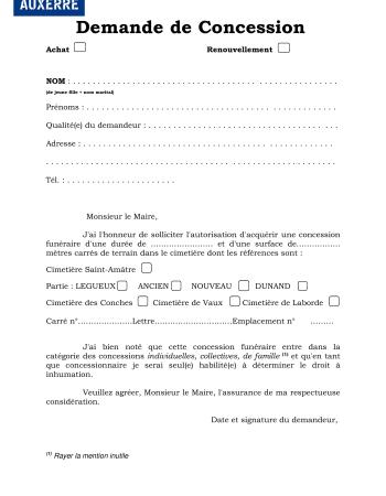 Toutes les informations concernant l'achat et le renouvellement de concessions, les concessions abandonnées et le tarif des entreprises funéraires. Retrouver un défunt Grâce à notre application vous pouvez désormais retrouver un défunt dans les cimetières d'Auxerre. --> Se rendre sur l'application Infos et renseignements Service Gestion des concessions funéraires Email. contactauxerre [point] com (contact[at]auxerre[dot]com) Tél. 0386520171 Adresse. 60 rue du 24 août, Auxerre, France En savoir plus Liste des opérateurs funéraires habilités par le préfet LISTE+DES+OPERATEURS+FUNERAIRES+HABILITES+PAR+LE+PREFET+DE+L'YONNE(1) Télécharger Taille : 121.22 Ko Extension du fichier : pdf Publié le 25 Aoû. 2025 Devis types Les devis-type, tels que définis dans la loi n° 2008-1350 du 19 décembre 2008 relative à la législation funéraire et dans l'arrêté ministériel du 23 août 2010 portant définition du modèle de devis applicable aux prestations fournies par les opérateurs funéraires, sont visibles sur l'écran d'affichage légal de la mairie annexe. Ils sont communicables sur demande à l'adresse etatcivilauxerre [point] com (etatcivil[at]auxerre[dot]com). Achat et renouvellement de concessions Auxerre compte cinq cimetières. Celui des Conches et celui de Saint-Amâtre sont à Auxerre même. Il y a aussi un cimetière à Laborde qui se compose d'une parcelle ancienne et d'une nouvelle parcelle. Le dernier se situe à Vaux. A Saint-Amâtre on dénombre 5 282 concessions et aux Conches 5 917 concessions. Le service Gestion des concessions funéraires vous informe et vous conseille sur vos demandes d'achat et de renouvellement de concession : Taris 2025 Tarifs Municipaux 2025 Télécharger Taille : 2 Mo Extension du fichier : pdf Publié le 02 Mai 2025 DEMANDE+DE+CONCESSION.pdf Télécharger Taille : 70.21 Ko Extension du fichier : pdf Publié le 25 Aoû. 2025 Liste des concessions renouvelables Concessions abandonnées État d'abandon Un concessionnaire doit pouvoir disposer de sa concession pendant la durée qu'il a choisie à condition qu'il l'entretienne. La procédure de reprise des concessions en état d'abandon (tombe délabrée, présence de végétation sauvage....) est une dérogation à ce droit, de ce fait, elle est soumise à une procédure stricte accompagnée de nombreuses mesures de publicité (diffusion de l'information). Elle se déroule sur 3 ans : Elle débute par de nombreuses mesures de publicité (affichage,....) Puis il y a l'établissement d'un procès verbal d'abandon qui est affiché et notifié afin d'informer les ayants droit des concessionnaires Trois ans plus tard, une nouvelle procédure est instruite. Si la concession est toujours en état d'abandon, elle pourra alors être reprise après vote en conseil municipal. Concessions en état d'abandon Vous trouverez dans les liens ci-dessous les références des concessions concernées par un constat d'abandon. Concessions reprises pour état d'abandon 2013 concessions+reprises+pour+état+d'abandon+2013 Télécharger Taille : 8.45 Ko Extension du fichier : pdf Publié le 25 Aoû. 2025 concessions reprises pour état d'abandon 2014 concessions+reprises+pour+état+d'abandon+2014 Télécharger Taille : 48.96 Ko Extension du fichier : pdf Publié le 25 Aoû. 2025
